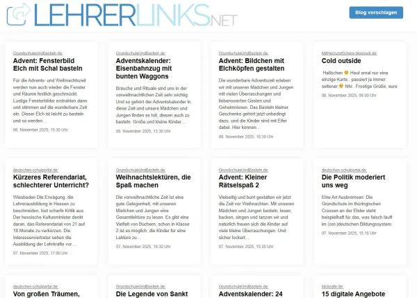Lehrerlinks.net ist eine der größten deutschsprachigen Sammlungen von Links zu Lehrerblogs, Unterrichtsmaterialien und Bildungsnews. Die Plattform bietet über 60.000 Einträge aus fast 100 Quellen, täglich aktualisiert und kostenlos ohne Anmeldung nutzbar. Ideal für Lehrkräfte, Referendar:innen und Studierende aller Schularten.