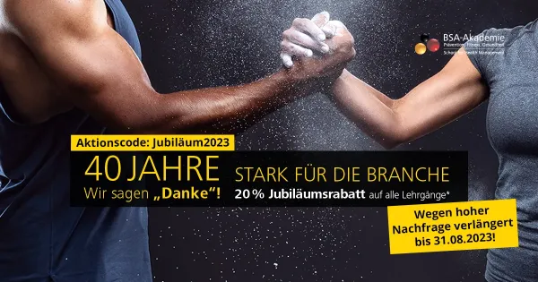 In diesem Jahr feiert die BSA-Akademie ihr 40-jähriges Jubiläum. Aus diesem Grund startete am 1. Juli eine große Jubiläumsaktion als Dankeschön für die Branche. Aufgrund der hohen Nachfrage verlängern wir den Aktionszeitraum bis zum 31. August 2023.