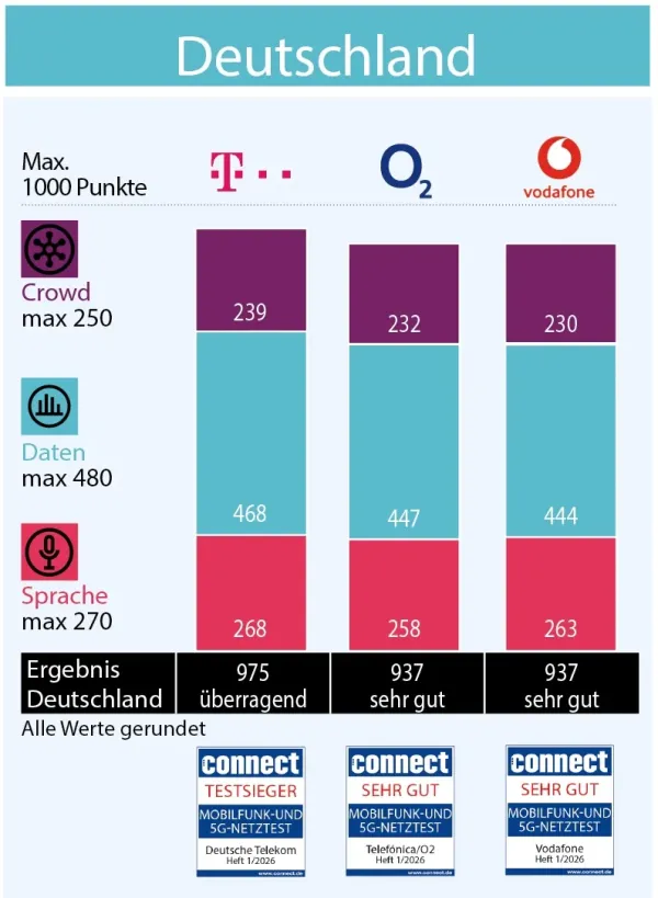 Die Deutsche Telekom erzielt zum fünfzehnten Mal in Folge den Gesamtsieg in Deutschland und zum vierten Mal ein "überragendes" Gesamtergebnis. Der Anbieter erreicht 975 von 1.000 möglichen Punkten und liegt in allen drei Testdisziplinen - Sprache, Daten und Crowdsourcing - klar vorn. Vodafone und O2/Telefonica erzielen mit 937 Punkten dieselbe Punktzahl und die Gesamtnote "sehr gut". Dabei erzielt O2/Telefonica mit einem Plus von 28 Punkten die größte Leistungssteigerung im gesamten Testfeld und liegt in der Daten- und in der Crowd-Disziplin sogar vor Vodafone. Vodafone kann in einigen Teildisziplinen zur Telekom aufschließen.