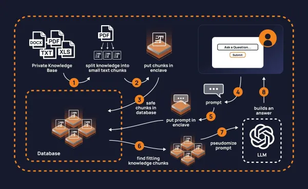 - Die Antwort des LLM oder SLM wird abschließend in der sicheren Enklave erneut mit den vertraulichen Daten angereichert und liefert dem Anwender ein vollumfängliches und validiertes Endergebnis.