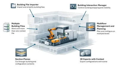 Mit der neuen Hauptversion 14 der P´X Industry Solution werden Maschinen und Anlagen nun noch einfacher im virtuellen Einbauraum errichtet. Mit einem neuen Workflow wird der Import für Gebäudedaten sicherer und leistungsfähiger. Die Planung und Verwaltung mehrere Stockwerke, Schnitt- und Ausschnittebenen erleichtert die Kollaboration mehrerer Fachbereiche ebenso wie den 3D-Export. Die mit über 100 Parametern und Constraints konfigurierbaren Anlagenkomponenten werden im IFC-Format des Building Information Modeling (BIM) per "drag and drop" platziert. Dies gilt für konfigurierte Maschinen ebenso wie für fremde Objekte.