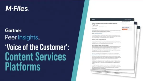 Der neue Report "Gartner Peer Insights 'Voice of the Customer': Content Services Platforms" bewertet Anbieter auf der Grundlage der folgenden Kategorien: Product Capabilities, Sales Experience, Deployment Experience and Support Experience. In den Gartner Peer Insights finden sich unter anderem die folgenden Antworten von M-Files-Kunden:
