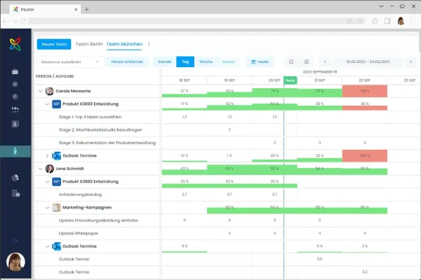 Aufgrund der verbesserten Benutzeroberfläche ist insbesondere die Ressourcenbelegung in InLoox nun komfortabler zu bedienen und lässt sich individuell einstellen. So kann die Ressourcenübersicht wahlweise in den Auflösungsstufen Stunde, Tag, Woche oder Monat angezeigt werden. Und um eine maßgeschneiderte Sicht auf die Auslastung der Teammitglieder zu erhalten, können Projektverantwortliche nun bei der Ansicht des Zeitrahmens auswählen, ob sie vordefinierte Zeitspannen oder individuell gewählte Daten aus dem Kalender verwenden wollen.