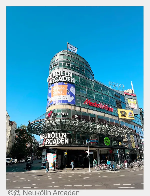 Zunächst als Forum Neukölln etabliert und 2003 als Neukölln Arcaden wiedereröffnet, ist das Shoppingcenter an der Karl-Marx-Straße heute der zentrale Nahversorger in Neukölln. Ob Mode, Kosmetik, Elektronik oder Lebensmittel - in den rund 50 Shops der Neukölln Arcaden finden Anwohner und Besucher alles, was sie im Alltag brauchen. Darüber hinaus bieten die Arcaden mit dem beliebten Kunst- und Kulturdachgarten Klunkerkranich, der Stadtbibliothek Neukölln und dem Cineplex-Kino, Berlins drittgrößtem Lichtspielhaus, vielfältige Freizeitangebote. Auch Sportbegeisterte kommen im über 2.500 qm großen Fitnessstudio SuperFit Lifestyle-Club auf ihre Kosten.