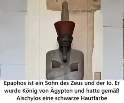 Eine bemerkenswerte Überlieferung stammt vom Tragödiendichter Aischylos, der Epaphos ausdrücklich eine „schwarze Hautfarbe“ zuschreibt. Kurioserweise hatte seine Mutter Io die Gestalt einer weißen Kuh. Diese Darstellung ist in der griechischen Mythologie ungewöhnlich und hebt Epaphos deutlich von vielen anderen mythischen Figuren ab. Sie verweist auf eine bewusste Verbindung zur afrikanischen bzw. ägyptischen Welt und macht ihn zu einer symbolisch aufgeladenen Figur im Spannungsfeld antiker Kulturen. Es besteht die große Frage, weshalb derart deutlich auf die schwarze Hautfarbe des Epaphos aufmerksam gemacht wird.