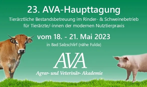 Nicht nur der Beitrag der Tierschutzbeauftragten anlässlich der 23. AVA-Haupttagung vom 18. bis 21. Mai 2023 in Bad Salzschlirf (Nähe Fulda) bietet für Nutztierärzte eine sehr gute Gelegenheit, sich mit den angebotenen Themen zu Tiergesundheit und -prävention, Tierschutz und Tierwohl der Rinder- und Schweine-Tiermedizin auseinanderzusetzen und neue Erkenntnisse und Erfahrungen innerhalb der an der Tagung teilnehmenden Tierärzteschaft zu diskutieren, die bereits bei den nächsten Betriebsbesuchen aufgrund der praxisnähe der AVA-Veranstaltung Anwendung finden können.