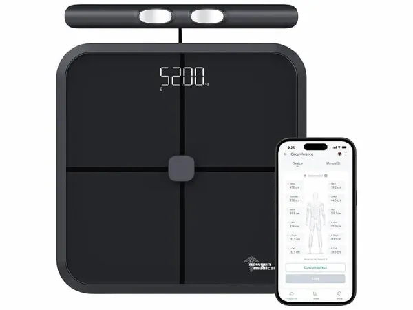 Die digitale newgen medicals Körperfettwaage mit Handsensoren und Bluetooth-App ist ab sofort bei