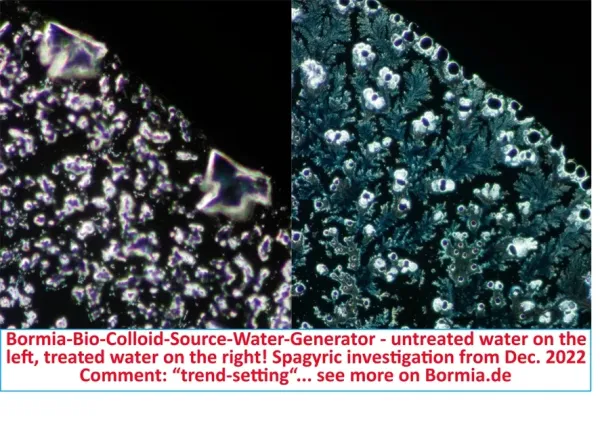 Zertifizierungen in der Wasseraufbereitung klären die Frage "Was ist gut für die menschliche Gesundheit und für unsere Lebensmittel? Bormia, als Anbieter natürlicher Wasseraufbereitung und des Kolloid-Homogenisierers, baut seinen wissenschaftlichen Vorsprung mit zwei weiteren Zertifizierungen deutlich aus! Vier aussagekräftige und wissenschaftlich anerkannte Testverfahren zur Frage "Was bewirkt ein natürliches Vitalwasser?" liegen vor. Bisher waren für Bormia die Zellbiologie, d. h. die Bioverfügbarkeit und damit der Gesundheit von Körperzellen sowie die Biophysik d. h. die Wirkung von Vitalwasser auf das gesamte Drüsensystem und in der Folge für die Gesundheit richtungsweisend! Bormia erweitert beide Zertifizierungen um die traditionelle Methode der Spagyrik und um wissenschaftliche Erkenntnisse im Buch von Prof. Gerald Pollack (USA) "Wasser ist mehr als H²O" Seite 108. Die Untersuchung der Spagyrik wurde mit der Kurzformel "richtungsweisen" kommentiert! Sie zeigt auffällige Bilder mit hochlebendiger Wasserstrukturierung, deren Wirkung auf die Gesundheit in vielen Studien erforscht ist. Im Buch von Prof. Pollack, einem weltbekannten Wasserforscher, gab es eine 1:1 Übereinstimmung. Bei der Frage nach dem "maximalen Energieeintrag in einem vitalen Trinkwasser" misst Prof. G. Pollack eine "3.000 nm Nanometer-Wellenlänge - ein tiefes Infrarot". Diese Größe wurde 2006 in einer Qualitätsstudie bei Bormia gemessen - eine handgefertigte Wasseraufbereitungsanlage (Prototyp).