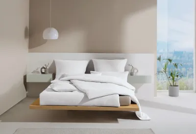 Homewear als Stilbaustein: Die Erwin Müller Damen-Satin-Kollektion (Shorty, Nachthemd, Schlafanzug) ergänzt den ruhigen Look mit einem sanften Glanz, als bewusst "edles" Gegengewicht zur strukturierten Bettwäsche.
