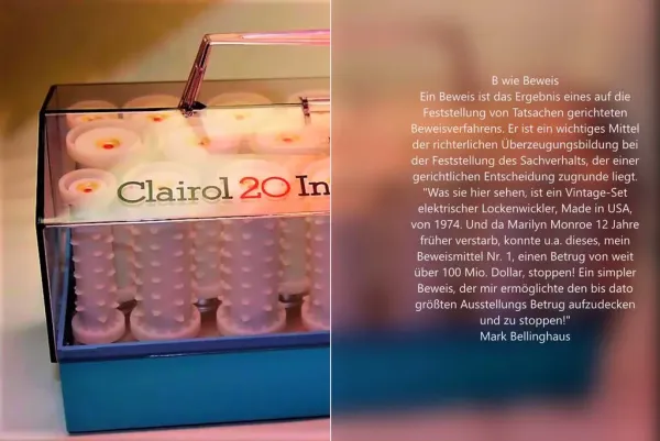 Ich gewann klar und logisch, mit diesen falschen Lockenwickler-Set, so eins, wie es hinter Glas als etwas kostbares ausgestellt wurde, in Long Beach, USA, bei der Ausstellungseröffnung, weil diese Plastiklockenwickler, so fand ich schnell heraus, aus dem Jahr 1974 stammten.