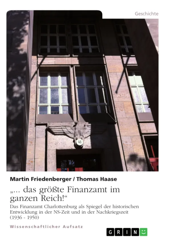 In Berlin befinden sich noch an vielen Orten Bauten aus der Zeit des Nationalsozialismus, die die bauliche Ästhetik und den absoluten Machtanspruch des NS-Staates abbilden. Eines davon ist das Finanzamt Charlottenburg, dessen Geschichte Dr. Martin Friedenberger und Thomas Haase in ihrem Buch "... das größte Finanzamt im ganzen Reich! Das Finanzamt Charlottenburg als Spiegel der historischen Entwicklung in der NS-Zeit und in der Nachkriegszeit (1936 - 1950)" (https://www.grin.com/document/1703788), das im März 2026 bei GRIN erschienen ist, näher beleuchten.
