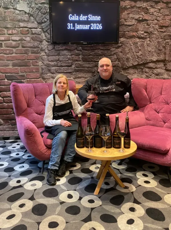 Gemeinsam kreiert. Von der "Magie des Weines" haben sich Küchenchef Thomas Meischner und Martina Hocke, staatlich geprüfte Sommeliere und Goldmundschenk des Mercure Tagungs- & Landhotel Krefeld, inspirieren lassen. Denn im Austausch mit Felix Nickel Schappert stellten sie ein Feinschmecker-Menü zusammen, das harmonisch mit der Weinauswahl korrespondieren wird. "Zum Aperitif auf dem "freiRaum" werden wir unsere Gäste mit Josefine Secco Rose und Sauvignon Blanc Secco begrüßen", so Martina Hocke und ergänzt mit einem Augenzwinkern. "Dazu reichen wir feines "Schmakofatz" - eine Überraschung für den Gaumen." Im stilvollen Ambiente des Restaurants "Augenblick" werden die Gäste zum Auftakt des Menüs mit kalt gegartem Winter- Kabeljaurücken mit Papaya, Avocado, Ur-Tomate und Grapefruit-Kaviar verwöhnt, abgerundet mit einer Buttermilch-Vinaigrette. Dazu reicht das Mercure-Team einen 2024 Pinot Blanc Urgestein. Als zweiten Gang wird eine Creme-Suppe von der Petersilienwurzel mit knusprigen Crostini, Ziegenkäse und Thymian-Honig serviert. Diese wird geschmacklich von einem 2023 Sauvignon Blanc Grande Reserve Magnum unterstützt, der aus einer Sonderabfüllung ausgeschenkt wird. Ein orientalisch mit Blütenkonfekt gewürztes Safraneis folgt darauf als Zwischengang, begleitet von einer 2023 Riesling Trockenbeerenauslese. Als Hauptgang überzeugt dann ein "Supreme" vom Kalb mit Kräuterkruste und Wintertrüffelsauce an Kartoffel-Gemüse Nest mit Estragon Hollandaise. Dazu können die Gäste sowohl einen 2019 Schabberne Cabernet Cortis trocken als auch einen 2023 Saigner Rose trocken genießen. Zum Finale wird ein "Feiner Abschluss" mit Limette, grünem Tee und Fenchel kredenzt, der vom 2024 Nickel Rose feinherb begleitet wird.