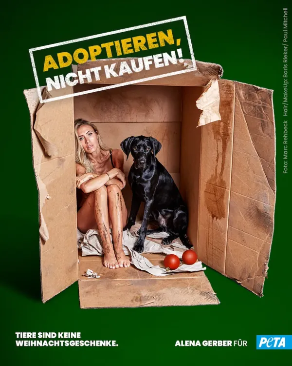 Klare Message, ungewohnter Look! Topmodel und Schauspielerin Alena Gerber engagiert sich jetzt mit neuem Motiv und gemeinsam mit ihrem adoptierten Hund Onyx für ein ernstes Thema: "Tiere sind keine Weihnachtsgeschenke!"