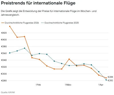 "Wir möchten Reisende mit dem Flugpreistrends-Dashboard unterstützen, informierte Entscheidungen zu treffen", sagt Yvonne Bonanati von KAYAK. "Flugpreise sind von vielen verschiedenen Faktoren abhängig und entwickeln sich nicht für jede Destination gleich. So waren Flüge nach New York in der letzten Märzwoche elf Prozent teurer als im Vorjahreszeitraum, während Wien 20 Prozent günstiger zu erreichen war."