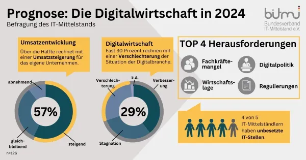 Die Jahresprognose des Bundesverband IT-Mittelstand e.V. (BITMi) zeigt: Der Großteil der mittelständischen IT-Wirtschaft hat weiterhin einen positiven Ausblick auf das neue Jahr für das eigene Unternehmen, erwartet aber eine Stagnation oder Verschlechterung der Situation der deutschen Digitalbranche insgesamt. So rechnen über die Hälfte (57 Prozent) der dafür befragten IT-Mittelständler mit einer Umsatzsteigerung. Ein Drittel erwartet einen gleichbleibenden Umsatz im kommenden Jahr. Gleichzeitig gehen fast 30 Prozent von einer Verschlechterung und nur 40 Prozent von einer Verbesserung der Situation der deutschen IT-Branche aus. Ein Grund für diesen gegenüber dem Vorjahr kritischeren Ausblick ist die weiterhin schwierige Wirtschaftslage, aber auch die geringe Priorität, die die Digitalisierung derzeit in der Politik erfährt. Beides sehen etwas über die Hälfte (56 Prozent) als größte Herausforderungen für die Digitalwirtschaft. Eine weitere Herausforderung für fast ein Viertel der Befragten sind gesetzliche Regulierungen, die Pflichten und Kosten auferlegen, die besonders für kleine und mittlere Unternehmen (KMU) eine große Last darstellen.