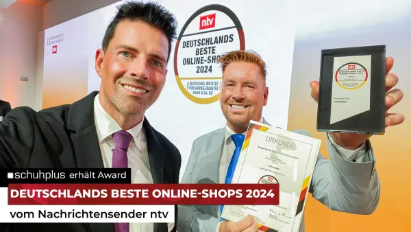 (Berlin/Dörverden/Saterland) (28.08.2024) - Der auf Schuhe in Übergrößen spezialisierte Fachhändler schuhplus ist am Dienstag in Berlin mit dem ntv-Award "Deutschlands Beste Online-Shops 2024" für herausragende Leistungen ausgezeichnet worden. Damit gehört das Familienunternehmen aus Niederachsen zu den führenden Webshops des Landes im Segment Schuhe. Der Nachrichtensender stellte die herausragende Nischenausrichtung ebenso wie den exzellenten Kundenservice heraus. Der Preis wird zum zehnten Mal von ntv gemeinsam mit dem Deutschen Institut für Service-Qualität (DISQ) vergeben. Grundlage für die Auszeichnung ist eine umfangreiche, repräsentative Befragung von deutschen Konsumenten. Rund 80.000 Kundenmeinungen wurden eingeholt und über 950 Anbieter von den Verbrauchern bewertet.