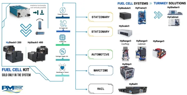 Seit 1998 fertigt Proton Motor die CO2-balanzierten Wasserstoff-Brennstoffzellen-Systeme basierend auf der Kernkomponente "HyStack®" zu nachhaltigen Hy-Markenprodukten für den stationären, maritimen, Heavy Duty und Schienen-/Bahn-Bereich. Hierzu gehören insbesondere die Brennstoffzellen-Systeme HyShelter®, HyModule®, HyFrame®, HyCabinet, HyRange®, HyShip® und HyRail®. Im Kontext des politischen Bewusstseins, dass Wasserstoff und Brennstoffzellen eine grundlegende Rolle bei der Überwindung der Klima- und Energiekrise spielen, geht Proton Motor Fuel Cell von einer stark steigenden Nachfrage aus. Besonders die alternative, unabhängige Energieerzeugung für Strom und Wärme inklusive unterbrechungsfreier bzw. Notstromversorgung kritischer Infrastrukturen garantiert internationale Wettbewerbsfähigkeit. Dies belegen unter anderem aktuelle Auftragseingänge für das HyShelter®-Kraftwerk in diesem Jahr von Neukunden wie "Universität Stuttgart" für die Prozessplattform "WAVE-H2" und bezüglich des Infrastrukturprojekts "Green Hysland" auf Mallorca.